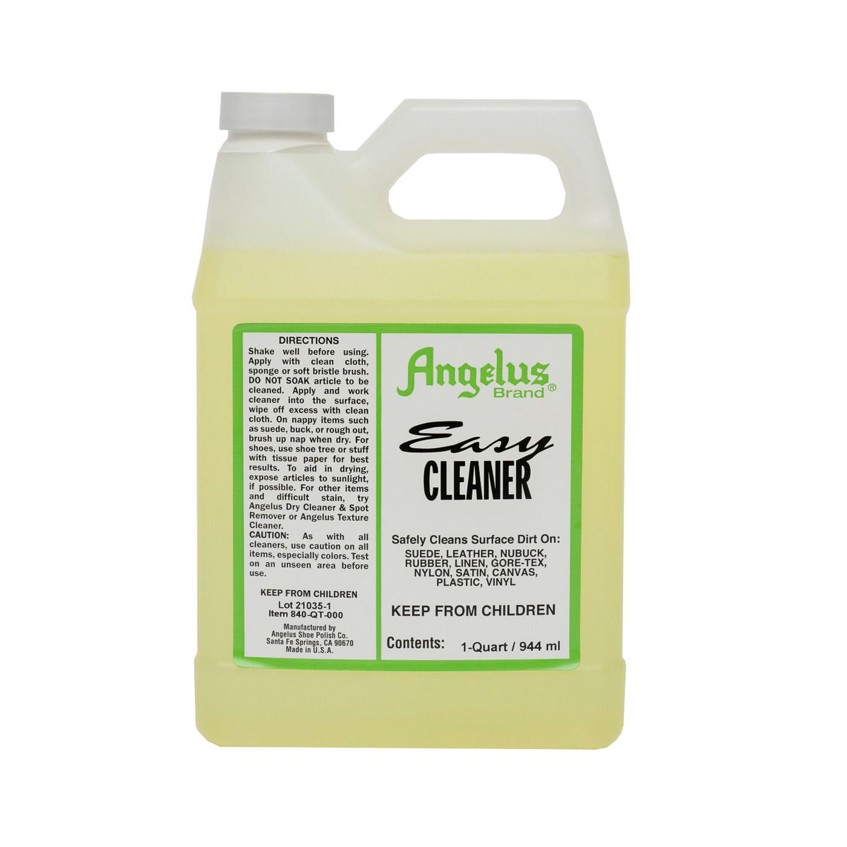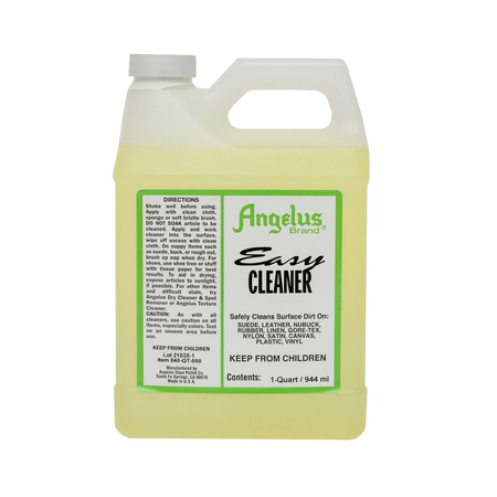 Angelus Easy Cleaner will remove most stains such as dirt, salt, food, perspiration, grease and cosmetics. Easy Cleaner can also be used on cuff and collar stains, straw, mesh and most synthetics. Will clean all leathers. As with all cleaners, test on small-unseen area before use. Directions Apply with clean cloth, sponge or soft bristle brush. DO NOT SOAK article to be cleaned. Apply and work cleaner into the surface, wipe off excess with clean cloth. On nappy items such as suede, buck, or rough out, brush up nap when dry. For shoes, use shoe tree or stuff with tissue paper for best results. To aid in drying, expose articles to sunlight, if possible.