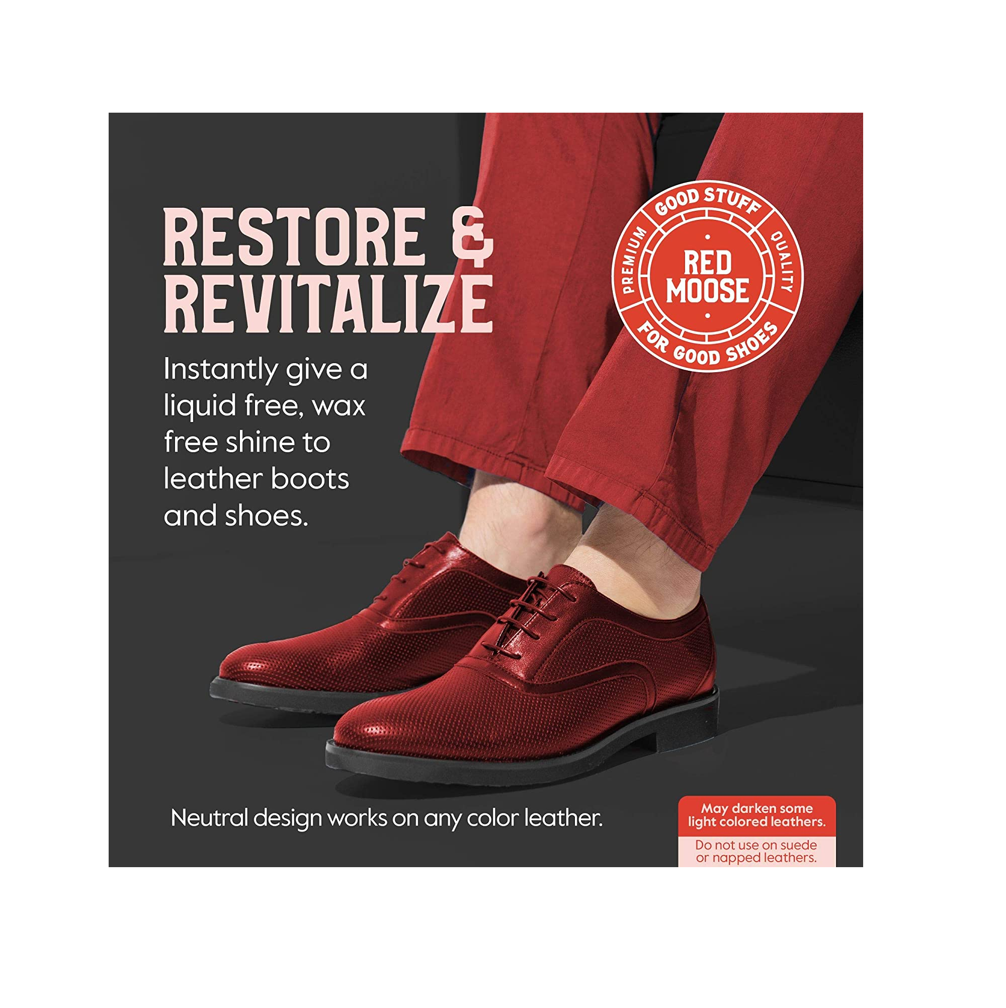 - GET IT DONE RIGHT. FAST. Quickly and easily bring dull leather back to life with the help of this sponge applicator. Red Moose Instant Shoe Shine is your new best friend - when you need to look your best and don't have time for a traditional treatment.