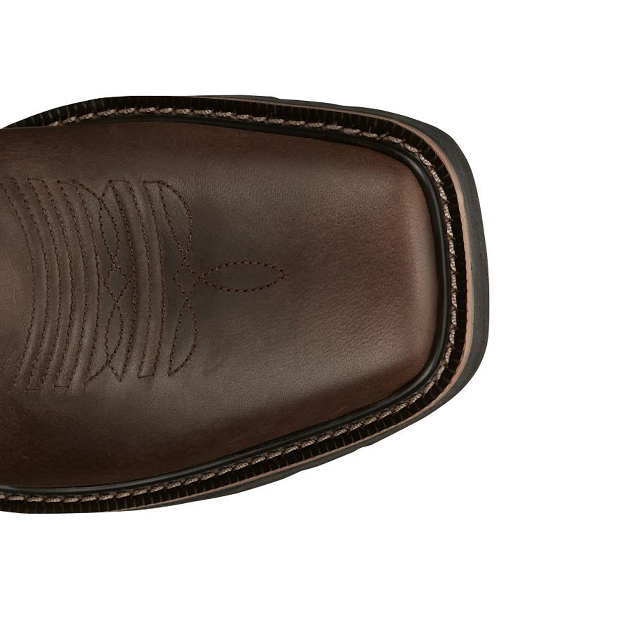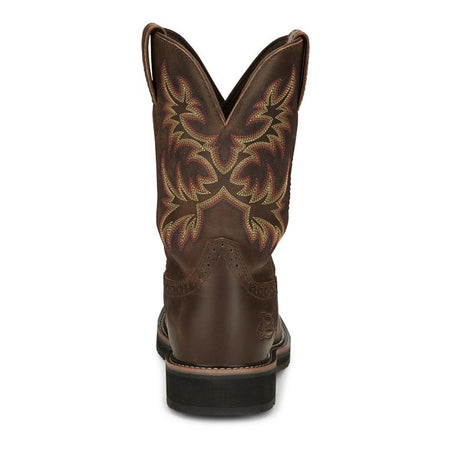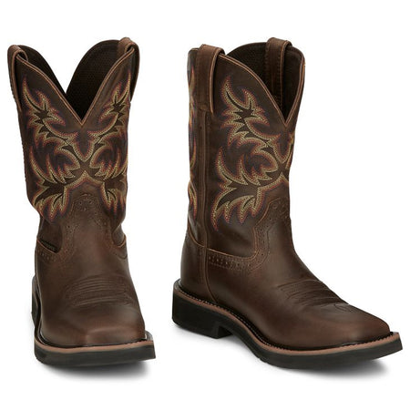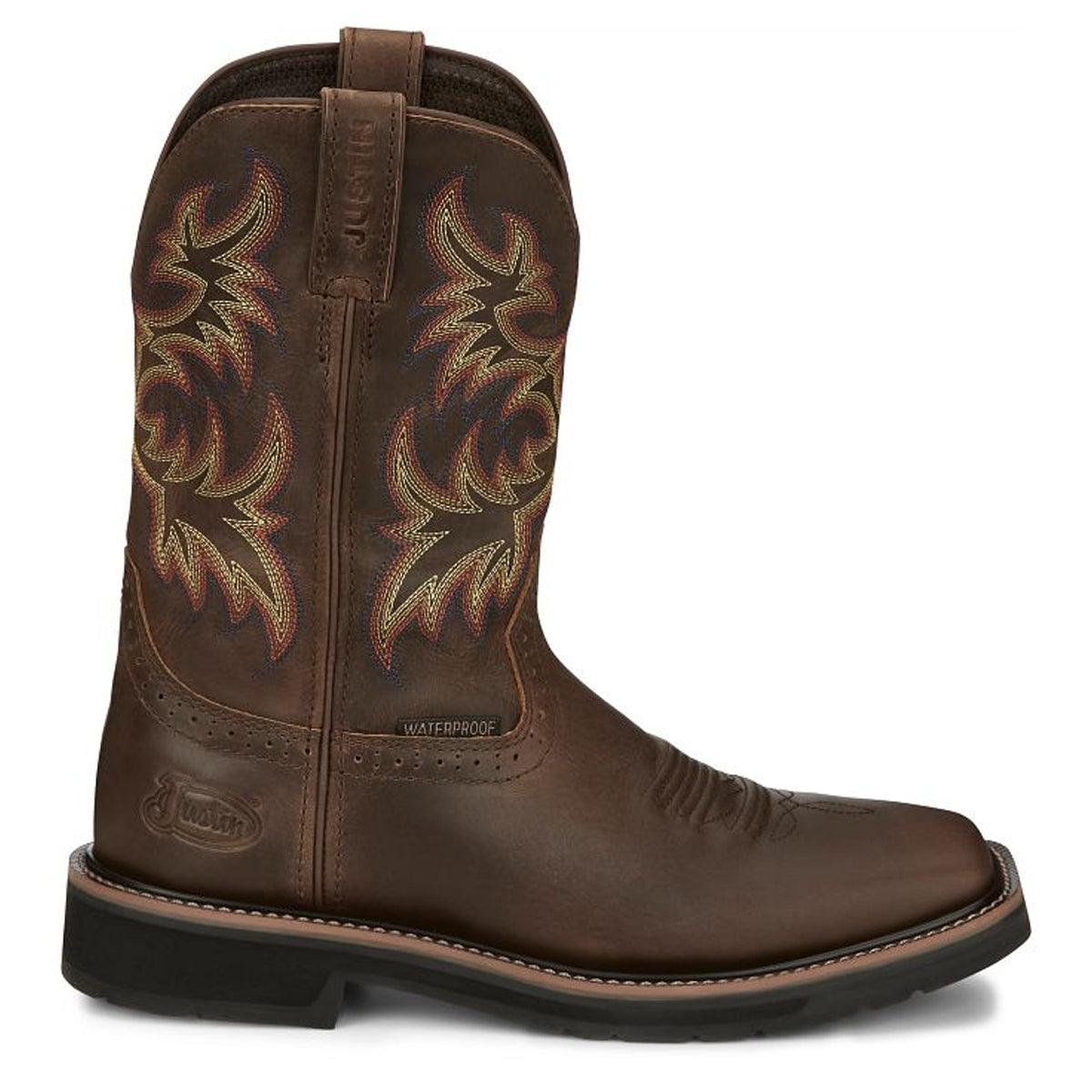 Its built for durability and comfort in even the roughest work conditions with a distressed golden brown leather exterior that is also waterproof for added protection against the outdoor elements. The yellow, orange, blue stitch pattern along the upper give this boot a retro feel and its square toe provides a relaxed fit. The J-Flex Flexible Comfort System insole cushions and supports the foot and the Stampede™ rubber and EVA combination outsole guarantees resistance to abrasion, chips, slipping, and marking allowing you to comfortably work on any surface.