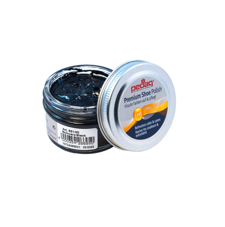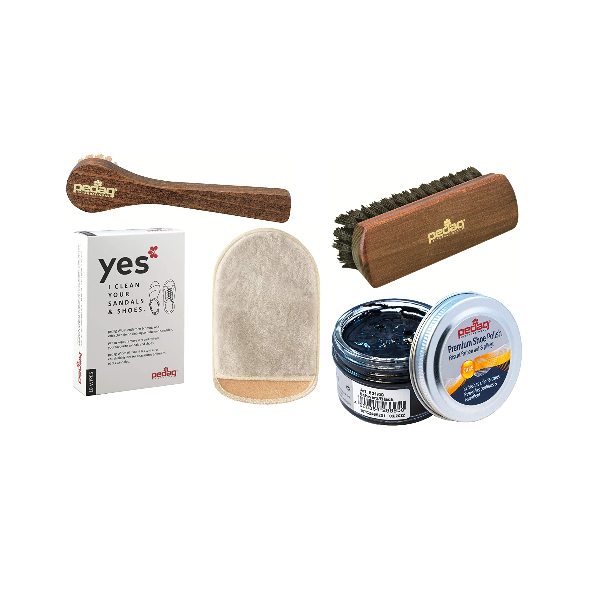 Pedag Leather shoe care kit for smooth and grained Leathers, ideal for climate membrane fabrics. Also suitable for bags, leather jackets, and leather upholstery. Art. 851 Cream polish has a four-way effect - refreshes color, nourishes the leather, protects against water and dirt, and produces long-lasting shine. It contains German montan wax (natural) for caring, protection, and shine. Cosmetic grade silicone oil allows care for fresh colors, suppleness, and optimizes Depth effect on Leathers. This leather shoe care kit has all items - Cream polish, applicator brush, polishing brush, polishing mitt, and cleaning wipes when you are on the go and need that quick clean. Pedag also makes water-proofers, ideal for all Leathers and textiles. A great addition to your Pedag Leather shoe care kit