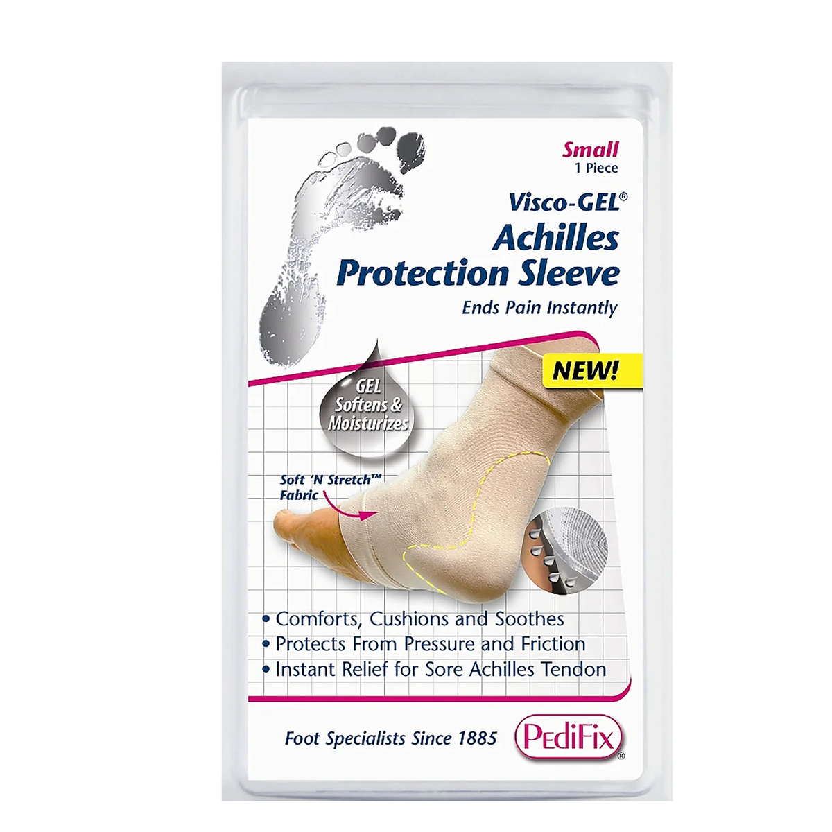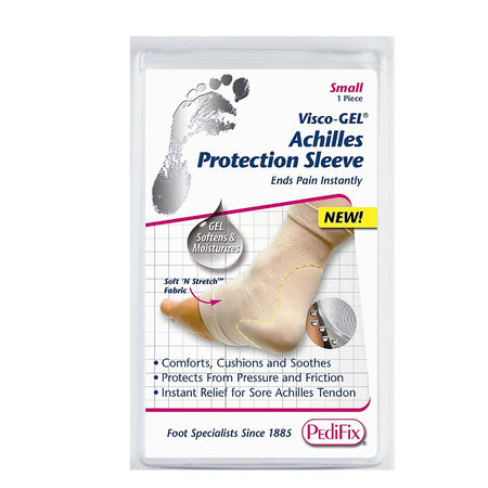 PediFix Visco-GEL Achilles Protection Sleeve comforts, cushions and protects the achilles from pressure and friction. For achilles tendonitis, bursitis, heel prominences, pump bumps (Haglund's Deformity), and any tenderness or redness at the back of the heel. Also moisturizes dry skin, as proprietary Visco-GEL releases mineral oil and vitamin E. Gentle compression of sleeve speeds healing. Slim design fits in most footwear.