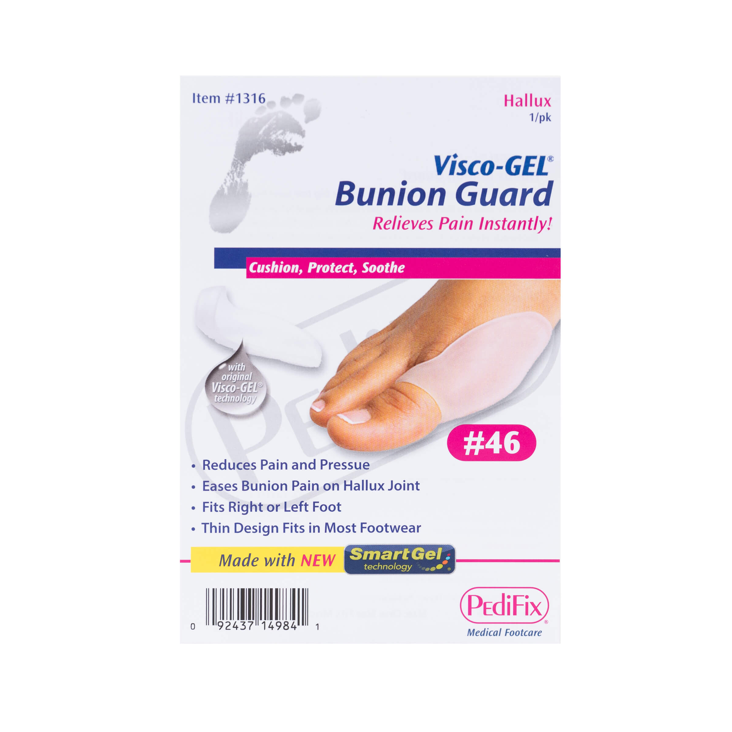 Hallux Guard 1/Pk For protection of the hallux and/or tailors bunion from friction and pressure Soft flexible gel shell cushions and comforts tender and sensitive skin and surrounding tissue Comfortable toe loop slides over toe to hold the product in place Thin profile design fits in all type of footwear Washable and reusable-