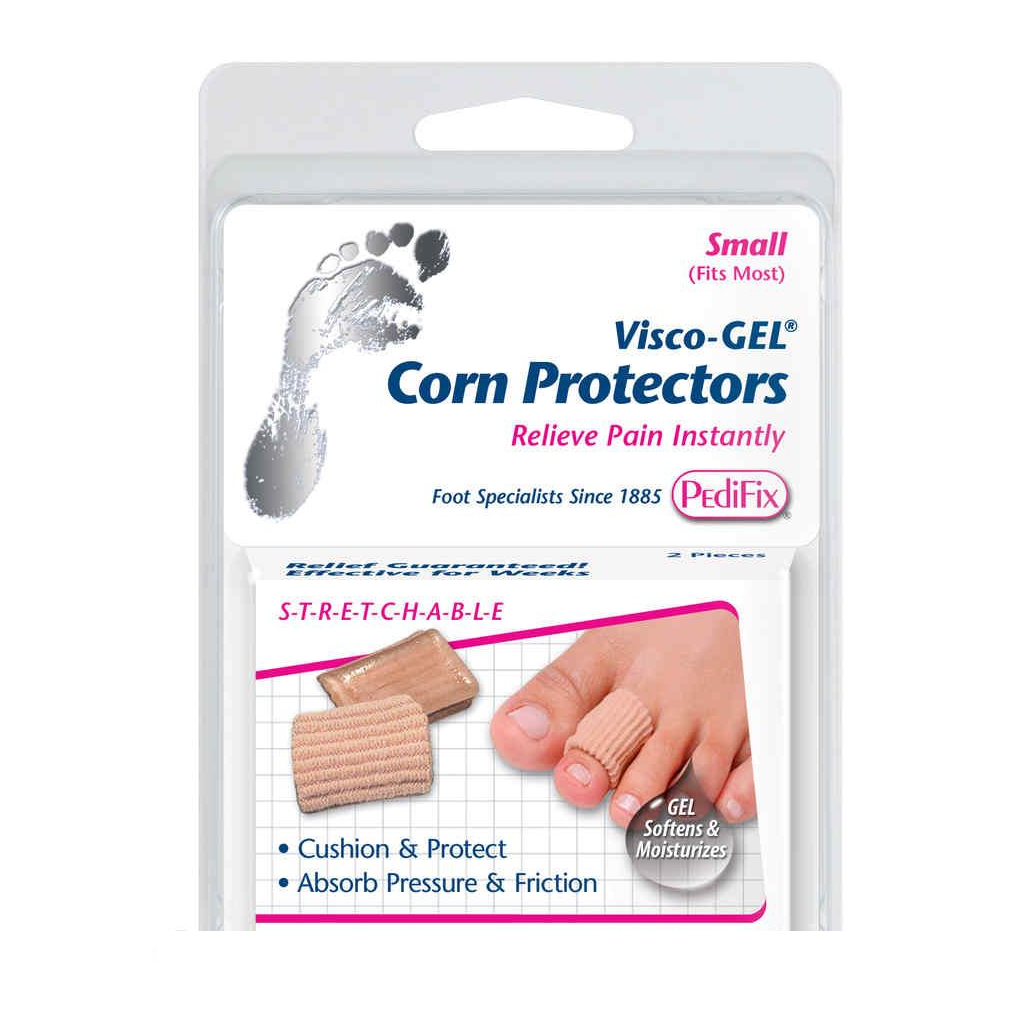 PediFix Visco-GEL Corn Protectors absorbs pressure & friction, protects, soothes and softens corns. Visco-GEL releases mineral oil enriched with vitamin E to moisturize skin while the Soft’N Stretch™ Fabric Sleeve keeps Gel in position without adhesives.