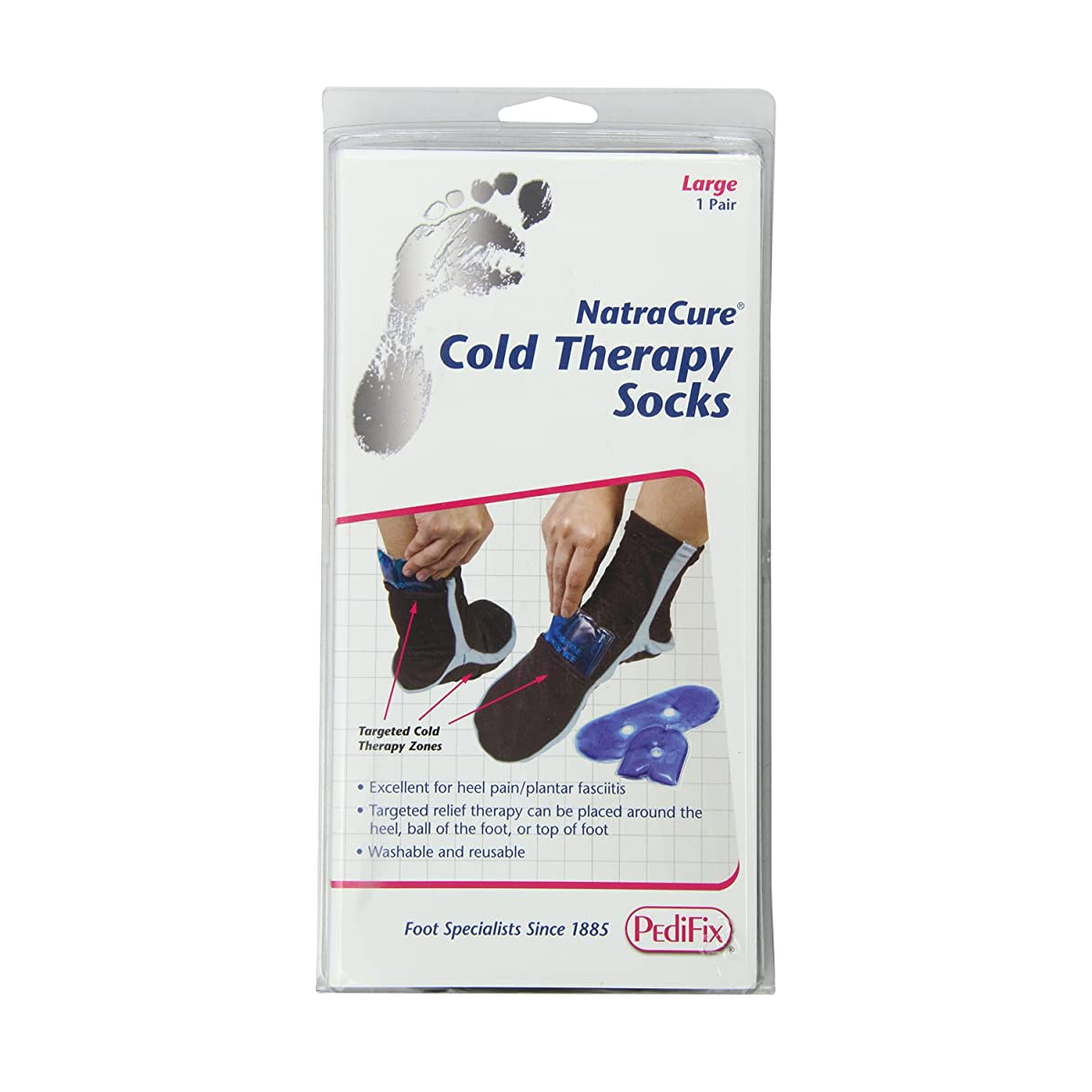 PediFix NatraCure Cold Therapy Socks provide targeted cold therapy. Socks have pockets sewn in to hold gel packs in place. Targets relief to heel, top or ball of the foot. Developed by a team of well-known Health Care Professionals. Cold therapy is excellent for heel/plantar fasciitis. Excellent for tired or aching muscles, strains or sprains. Soft, flannel-feel lining.
